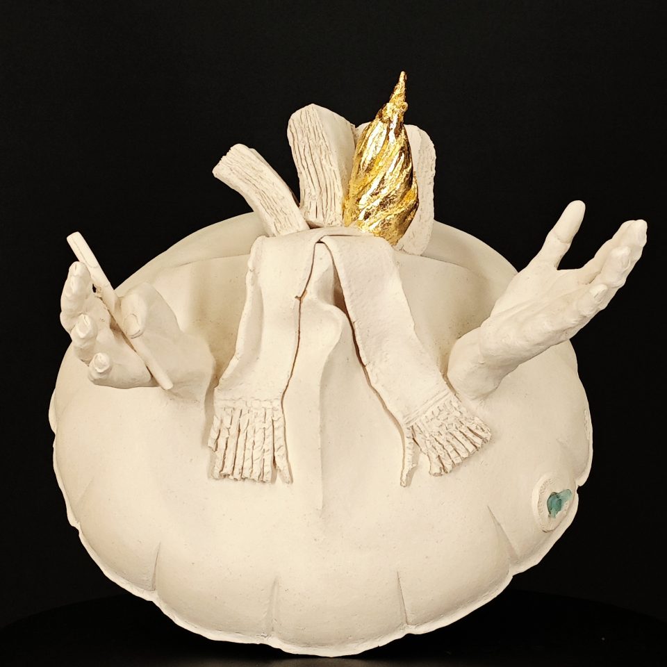 Dans cette œuvre, je suis inspiré par l’éclat de l’humanité et la résilience de l’esprit. J’utilise la terre cuite et la céramique pour forger des formes qui symbolisent l’ouverture et la réception, soulignées par des détails dorés qui représentent des fragments d’espoir et de valeur précieuse. Accrochée au mur de votre maison, cette sculpture respire un esprit de liberté et d’inspiration, invitant à une réflexion profonde sur les capacités infinies de l’humanité à surmonter les adversités.